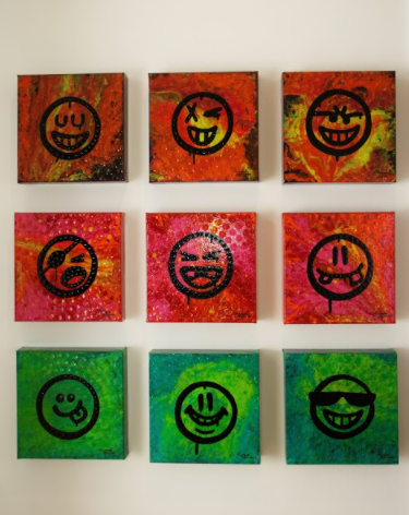 Angee Ferrin Happy Faces in Pandemic Times (series of 9) Acrylic on canvas 12 in x 12 in $150 each